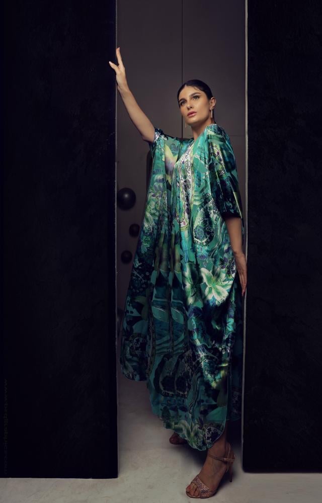 Product number: 2 pieces, a soft, light satin inner robe, and an outer piece of a jalabiya with a connected pattern design.