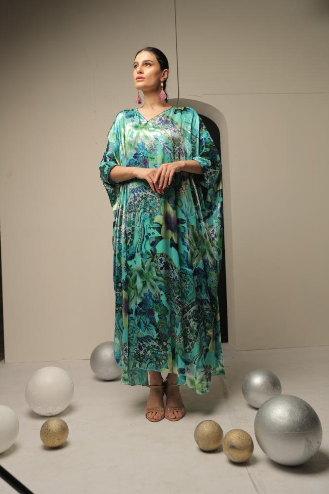 Description of the size of the pieces _ Length and width: Chiffon jalabiya with a print of different colors, an outer piece with medium coverage, the length of the piece is 54 inches, an inner piece “lining” with full coverage, the length is 51 inches, and the sleeves are connected.
